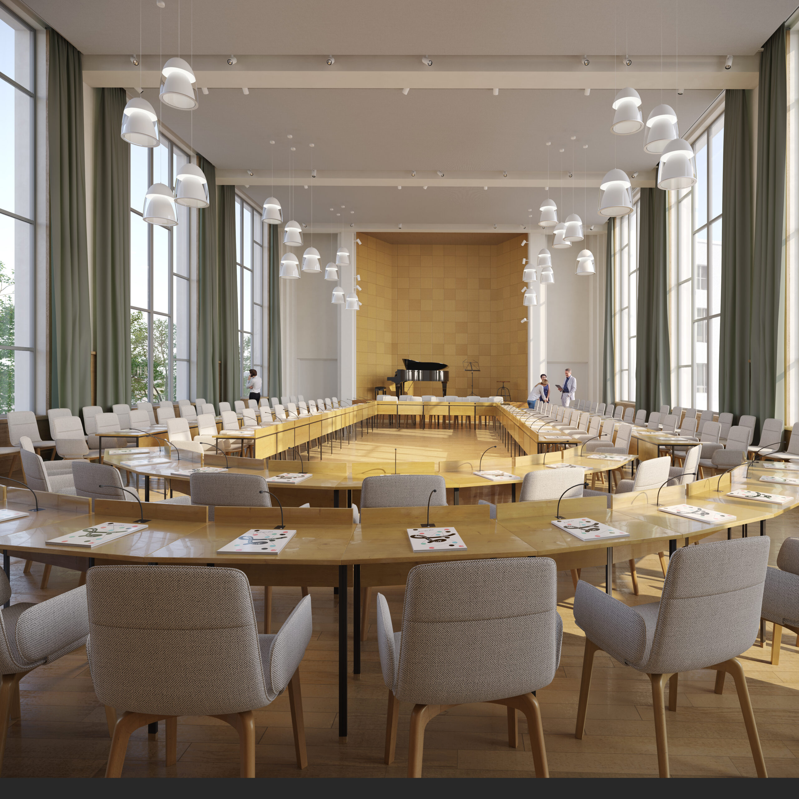 Le projet concerne la réhabilitation de la Maison de la Culture de Bourges, ensemble remarquable de l'architecture des années 30. L'enjeu des image était ici de proposer une intervention qui s'insère en douceur dans l'architecture existante conservée. Dans son expression brute pour le restaurant puisqu'aucun élément patrimonial ne pouvaient être gardés, et en réponse à de beaux éléments Arts Déco d'origine dans la salle du Conseil.