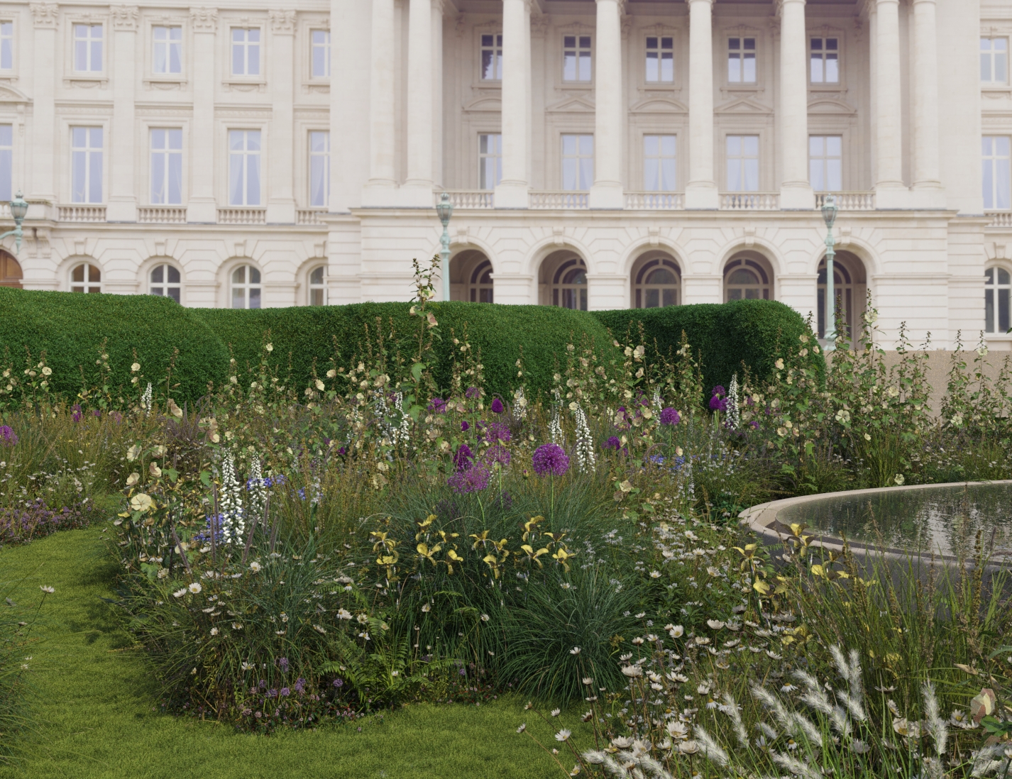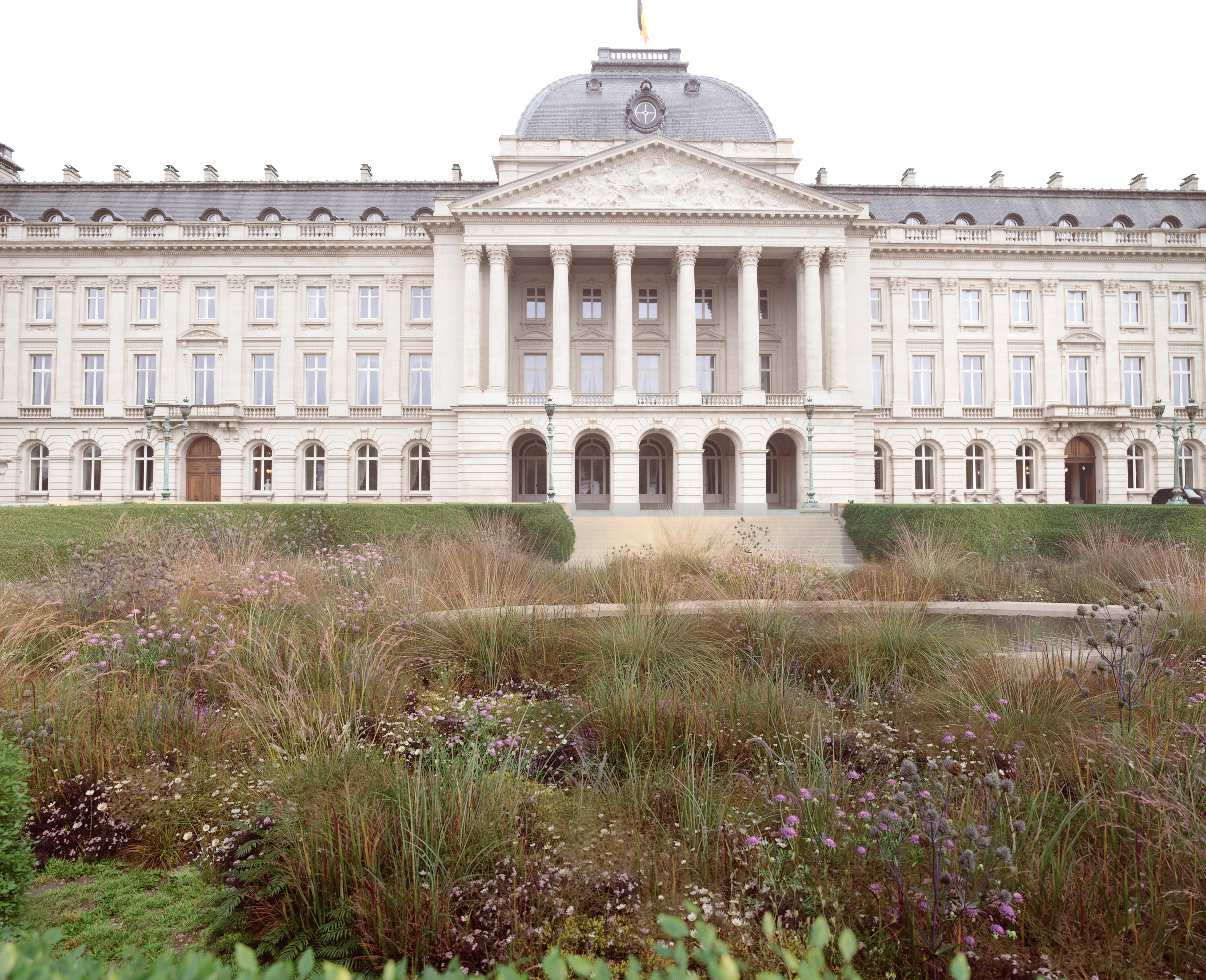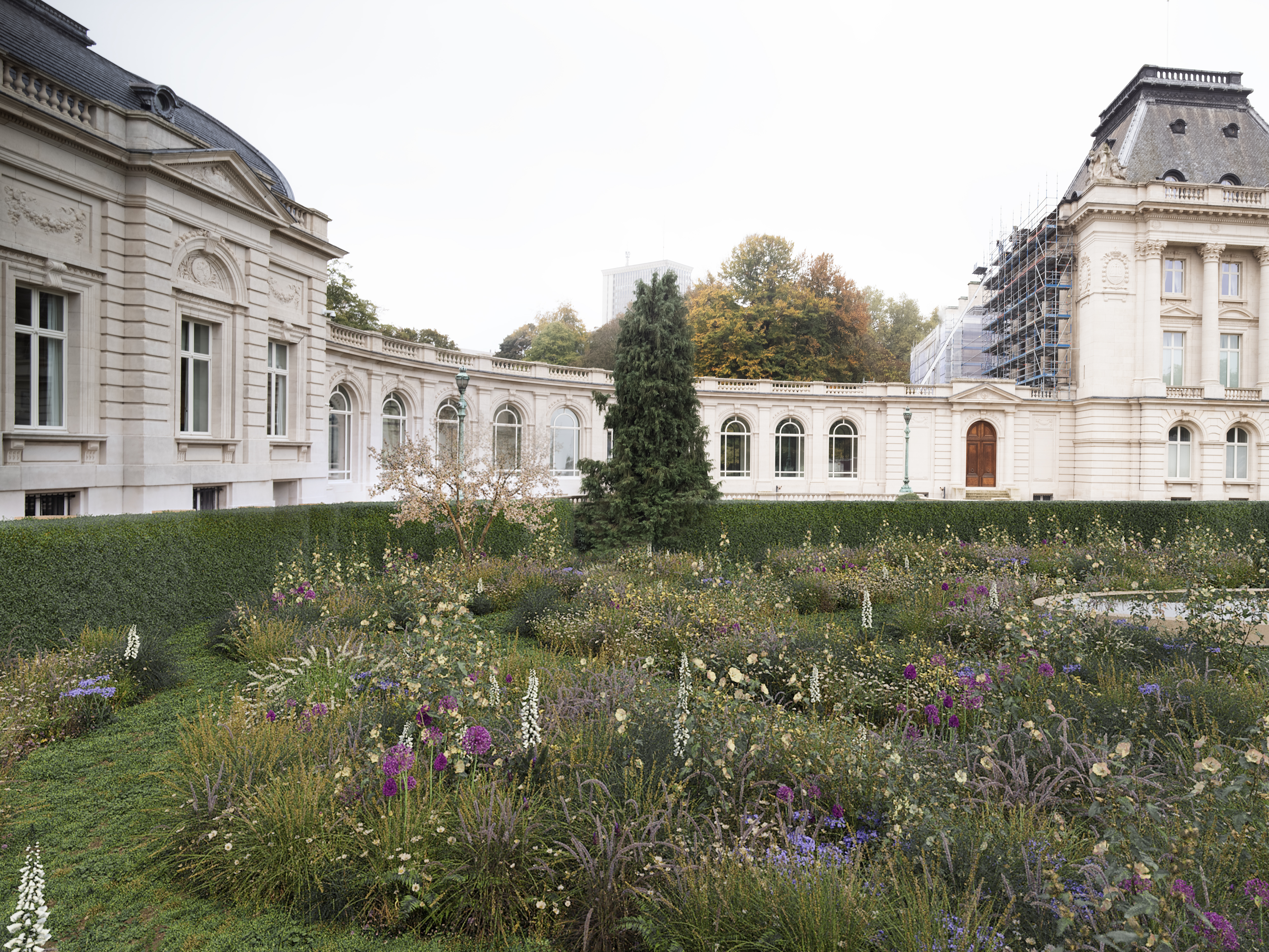 Pour développer un jardin, nous devons être aussi libres qu’un promeneur, libres dans le choix des cadrages. Un paysage ne se donne jamais d’un seul point de vue. Il se découvre par le parcours, par une suite de perceptions: cette démarche organise une expérience du jardin dans le temps et dans l’espace. Vient ensuite la sélection fine des plantes et des essences, pour produire des images de paysage précises et crédibles, liées aux saisons et aux contextes. Ici, depuis le palais comme depuis la rue, le jardin agit comme une frontière. Il se déploie en spirale, un mouvement continu, une petite galaxie végétale aspirée par un miroir d’eau.