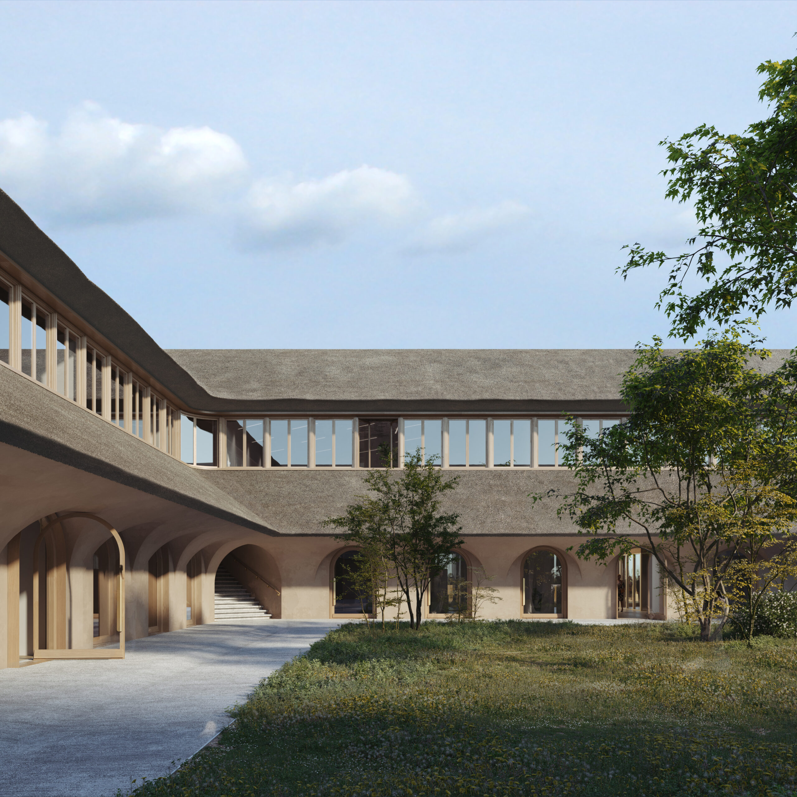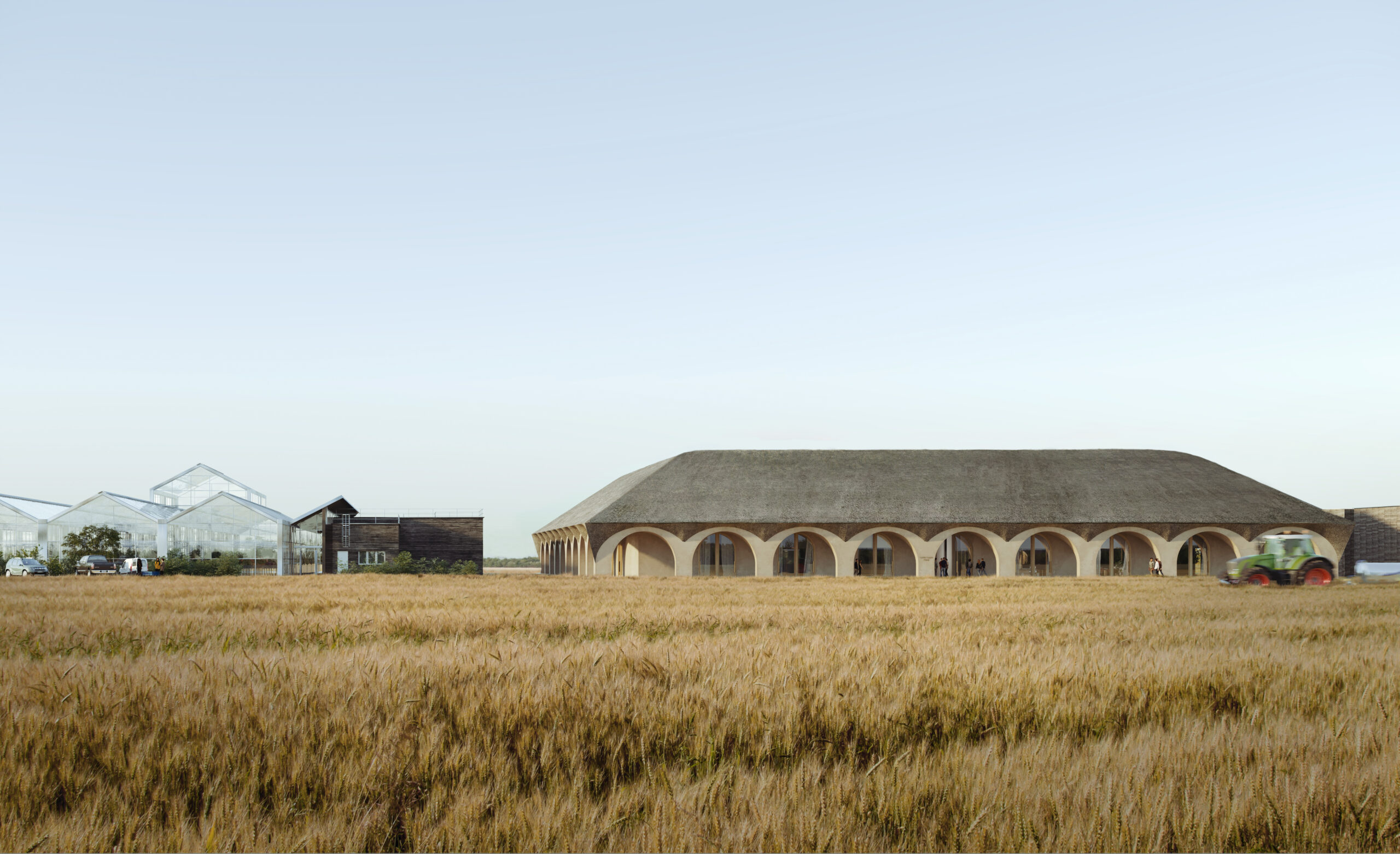 Le projet proposait d'inscrire le programme de Lycée agricole dans une seule forme forte. Cette réinterprétation du language rural composée d'un soubassement d'arcades en béton de chanvre couvert d'une immense toiture de chaume. La cour intérieure inscrite dans le carré offrant un espace calme à l'abris des vents. L'enjeu de la perspective principale a été de trouver une composition forte qui affirme la radicalité du projet dans son site agricole. Le dialogue entre les deux horizontalités du champs de blés et de la toiture de chaume résume la proposition en une image aisément mémorisable.