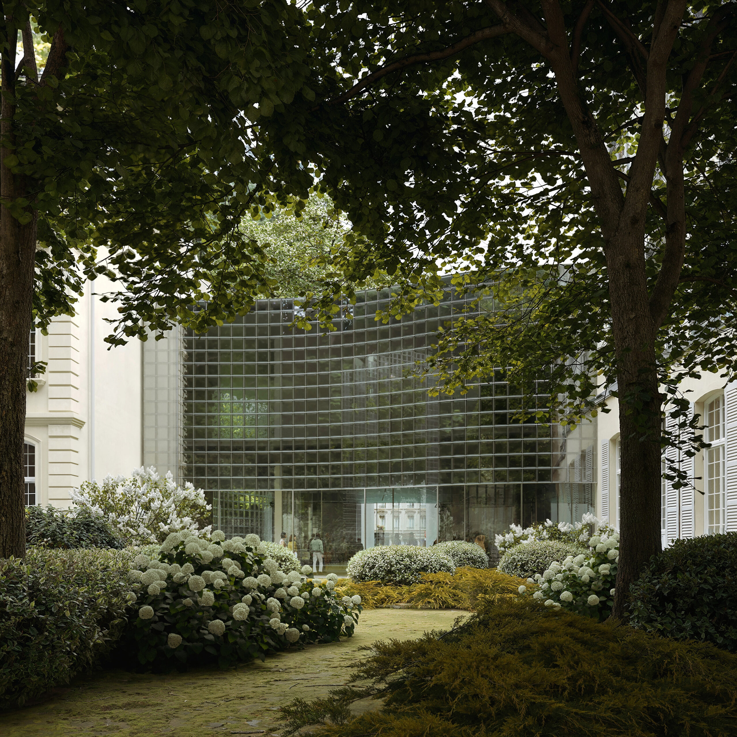 On a parfois la surprise de découvrir un sujet que l'on avait jamais eu l'occasion de traiter. C'est le cas du pavé de verre, auquel nous n'avions jamais été confronté. C'est l'opportunité d'un recherche assez plaisante, très technique avec en tête la maison de Chareau. Au delà de l'architecture, cette série a été aussi une de nos premières incursions dans le traitement du végétal, dans une approche plus construite, plus intellectualisé, dans la construction de l'image, avec a la fois une recherche de réalisme, mais aussi une recherche de composition séparé en différents plans, très picturale.